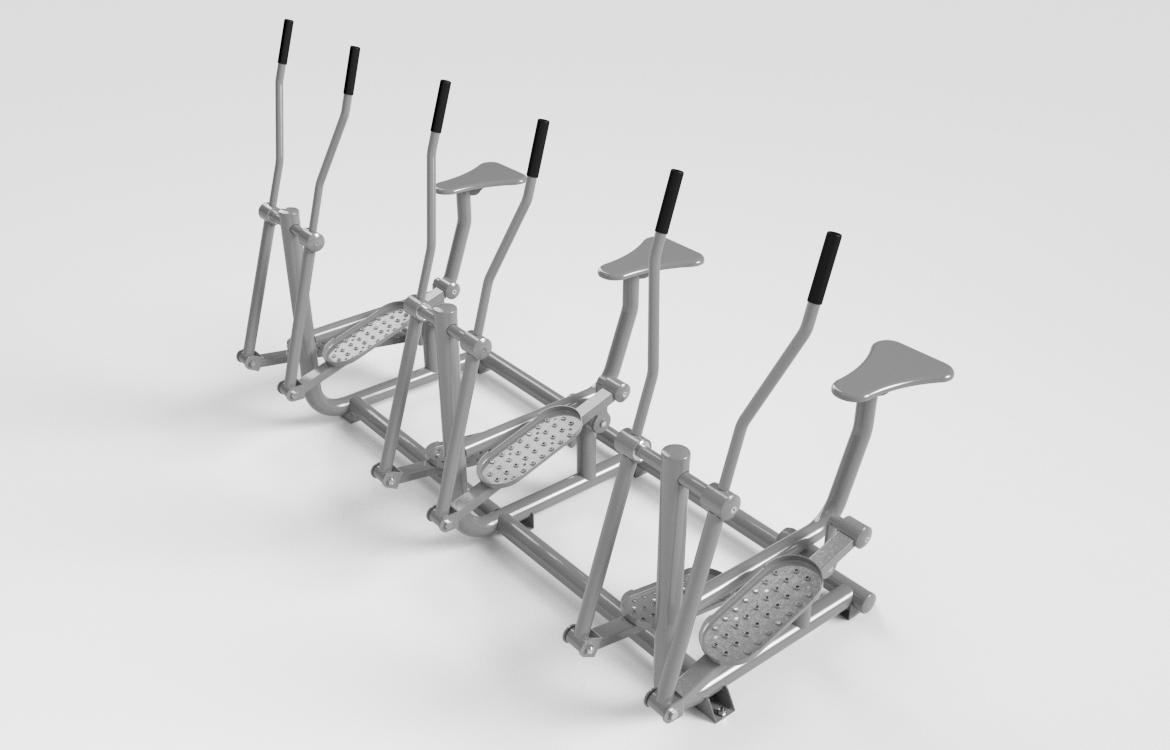 Fabricado com tubos de aço carbono de no mínimo 2 ½" x 2 mm. 2” x 2 mm. 1" ½ x 2 mm. 1" x 1,5 mm. Tubo de aço carbono trefilado 1”1/4’ x 3,56 mm schedule 40 (42,3 x 35,18 mm). 2” x 5,54 mm schedule 80 (60,3 x 49,22 mm). Metalão de no mínimo 30 x 50 x 2 mm. chapas de aço carbono de no mínimo 9,53 mm. 4,75 mm. 3 mm. pisantes fabricados em chapa de aço carbono de no mínimo 2 mm estampado, com cantos arredondados, assento fabricado em chapa de aço carbono de no mínimo 240 x 340 x 2 mm estampado, com cantos arredondados, tampas de aço carbono de 2 mm estampadas para proteção dos rolamentos. Utiliza eixos maciços, com rolamentos duplos, pintura a pó eletrostática poliéster, tampas em metal externas, solda mig, acabamento emborrachado. Permite a utilização de 3 (três) usuários simultâneos e oferece total segurança. Instalação em áreas fechadas ou ao ar livre, resistente às ações climáticas. Fixação do aparelho ao solo através de chumbador parabolt. Adesivo de identificação do produto, músculos exercitados e dicas para uso e funções do aparelho, dados do fabricante e contato para assistência técnica.